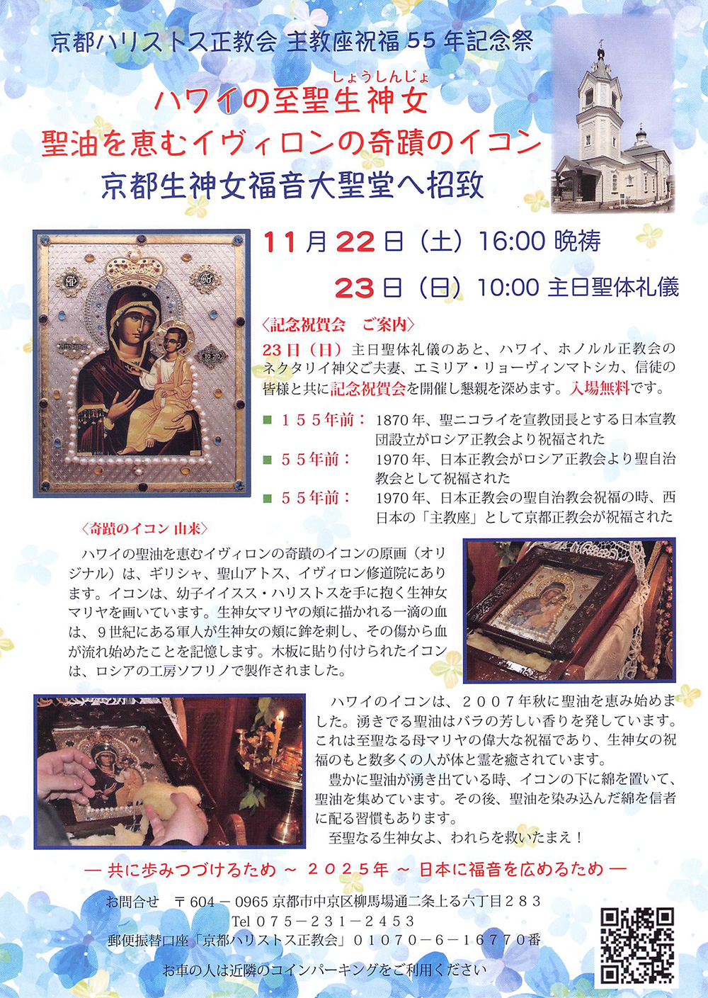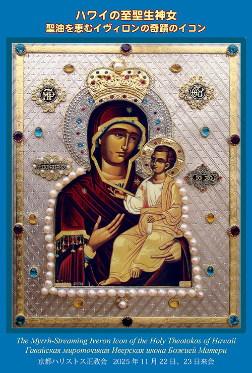 2025年11月22日(土)・23日(日) ハワイの至聖生神女 聖油を恵むイヴィロンの奇蹟のイコン 京都生神女福音大聖堂へ招致 2025-10-31 by webmaster ハワイの至聖生神女 聖油を恵むイヴィロンの奇蹟のイコン 京都生神女福音大聖堂へ招致 日時:2025年11月22日(土)・23日(日)